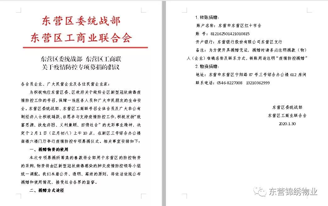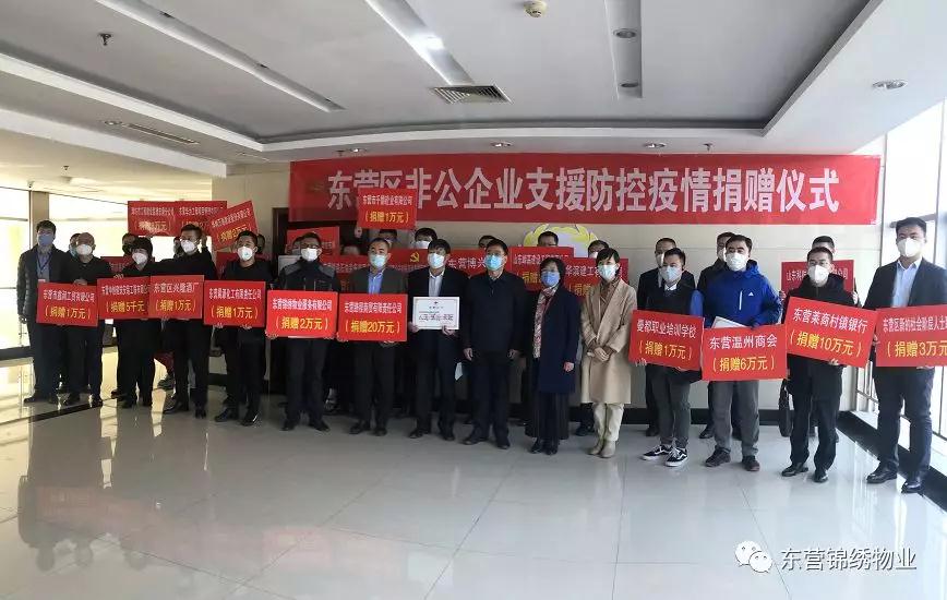 2月1日,东营区工商联在区政府3号楼六楼大厅举行了支援防控疫情捐赠仪式。区委常委、统战部部长杜书亮、副区长巴沾红、区工商联主席李玉琴、区红十字会会长张福寅等领导出席了此次捐赠仪式并讲话。30余家非公企业参加了捐赠仪式。东营锦绣物业参加了捐赠仪式并捐款2万元。