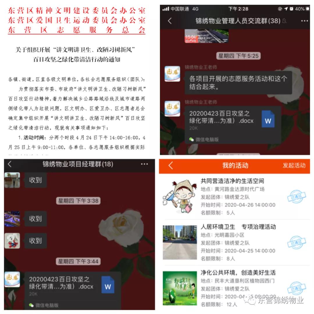 为贯彻落实市委、市政府“讲文明讲卫生、改陋习树新风”百日攻坚行动精神,按照上级主管部门的统一工作要求,东营锦绣物业公司高度重视,作为一项重要工作进行安排部署,要求各项目集体开展“清洁环境、美化家园”志愿活动。