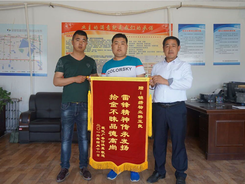 2016年4月19日上午,东营现代广告公司的付洪真拿着写有“雷锋精神传承发扬、拾金不昧品德高尚”的锦旗来到东营锦绣物业服务有限公司市政管养部办公大院,对一位绿化工人及公司连声感谢。