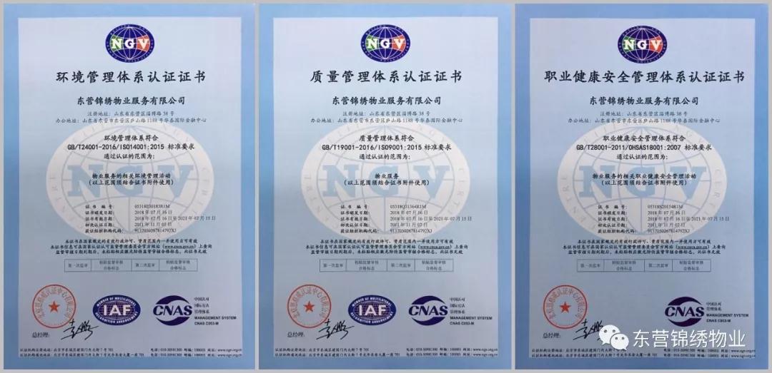 作者:管理员 2018-07-26 17:20:28 1515人浏览7月16日,东营锦绣物业服务有限公司取得由北京恩格威认证中心有限公司颁发的“环境管理体系、质量管理体系、职业健康安全管理体系”认证证书,这标志着公司顺利通过了新一轮管理体系认证评审。